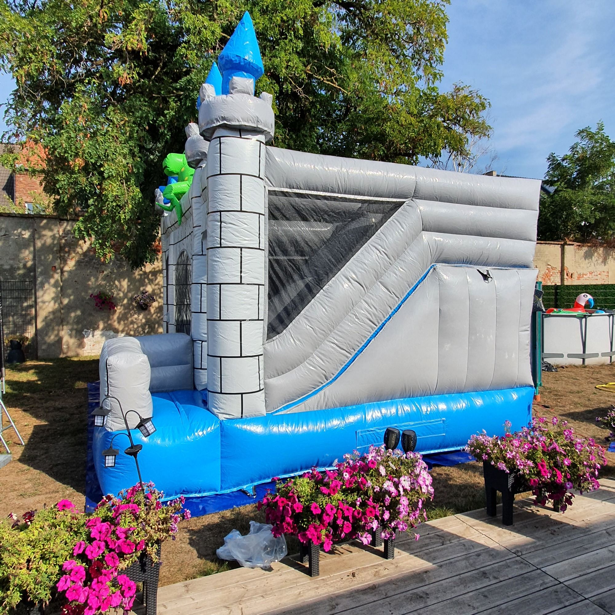 Ein Schloss wie es kleine Prinzessinnen und Prinzen lieben. Wunderschöne Farben, viele Türme und eine extra große Rutsche von 1,70 m lassen diese Hüpfburg zum Spieleparadies werden.