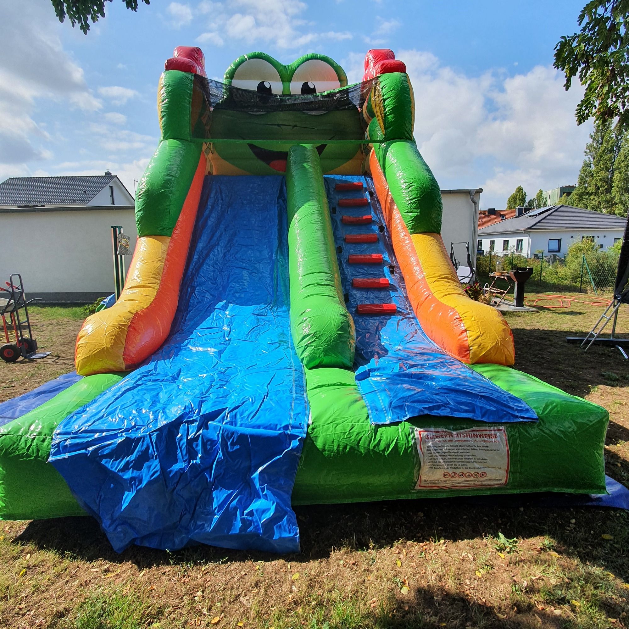 Unser lachender Frosch lädt Mädchen und Jungen ein zu ihm aufzusteigen, um dann die 2 m Rutsche herunter zu düsen.
